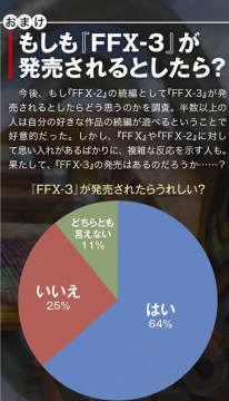 重制版新增的广播剧剧情、以及新编写的小说,似乎野岛一成已经在剧情上为《最终幻想X》系列的后续展开做好了充分的准备。而本周《Fami通》的一张调查表也有很深的意味。《最终幻想X-2》本身就是打破系列无续篇传统的作品,加上《最终幻想13》三部曲的推出,似乎《最终幻想X-3》也离我们越来越近。