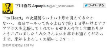 恋爱文字游戏《ToHeart3》即将于2014年公布 来源: 飞翔小编 2013/12/31 16:44:57 浏览量:855 经典恋爱文字游戏《ToHeart》系列将在2014年有新动向,根据其开发商AQUAPLUS社长下川直哉在12月30日发表的推特消息显示,《ToHeart》系列下一个展开终将成型,但并没有透露具体企划,估计《ToHeart3》即将于2014年公布。推特消息原文:据悉《ToHeart3》会在2016年AQUAPLUS二十周年庆典上正式公布,总之希望下川直哉社长能尽快给出一个满意的答复,别让玩家等待太久。