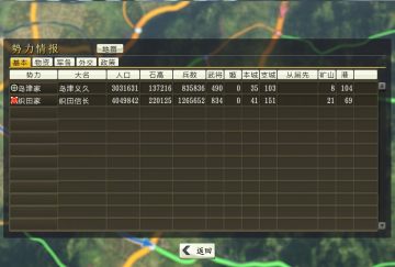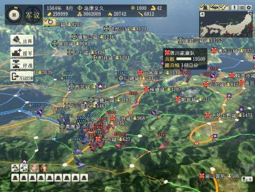 3、鏖战拉开序幕,我的作战方针是这样:自己控制刚开始的四个主城远程出兵,任命统帅高的为这些主城城主,分别为家久、义弘、毛利、元亲,其他让电脑负责完全自动,让我来配合电脑的运动战,这样做除了充分调动后方资源还可以防止名将被捕,但马上就发现四个主城明显不够,电脑的支援和设营用的特别好,没几下上万人就残了,于是改变直辖城市的为位置控制了9个主城,不断出兵配合电脑才拿了鸟取和后濑山城,刚开始暗暗自喜时候,此时信长风卷彩云的灭了武田和北条,逼近伊达。