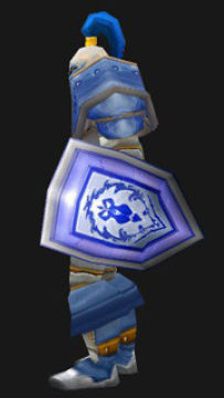 经数据库查证,相同模型的金色盾牌和蓝色盾牌各有两种,金色的是暴风城卫兵之盾和麦斯米兰之盾,蓝色的是暴风城纹章盾和夜色镇徽记之盾。