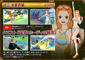 3DS游戏《海贼王 无尽世界R》将推出大量DLC服装和任务供玩家购买下载,其中就有娜美和罗宾的泳装,看上去绝对是绅士福利,此外泳装还附带了特殊属性,例如移动速度上升20%,水属性的伤害可以减少50%,相应的由于装备简单,最大HP将会降低15%,此外还有乔巴泳衣装,娜美和罗宾的学院装等,一起来看看吧。