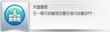 大型政府需要城市达到60W人口政满级市政厅放上所有模块即可完成,推荐按照sunbeyon大人的120W人口城市模型教程去尝试,基本可以完成