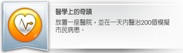 医院放置后基本可以直接完成这两个成就,如果没有200个市民病患,可以考虑关闭医院再开放。