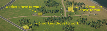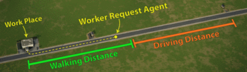 工作场所发出一个请求代理,包含多少工人需求。这个代理作为一个招聘人员签署你的模拟市民来上班。如果代理发现工人在步行距离之内,市民将走路去上班。如果没有,市民会开车上班。