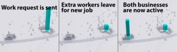 有时,一个工作轮班后每个人都已经进入了工作日。在这种情况下,员工请求系统将失败,因为没有市民在家里找工作。因此,当请求代理反馈和报告,并没有发现所需的最低工人,它将再次尝试。这一次,它会针对“额外的”员工的工作场所。这些“额外的”员工将离开自己目前的工作,以填补在新的工作空缺。而不是让一个公司都有大量的员工和另一个没有。现在,你有两个企业有足够的员工,以提高工作效率。Everyone’s happy!