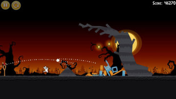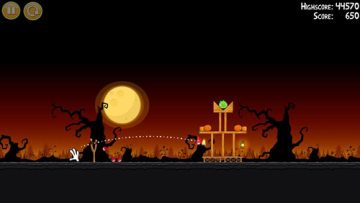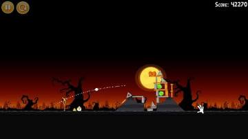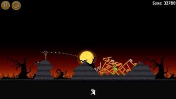 1-27:头两只鸟都如图方式拆掉左下角砖块和反弹摧毁上面的建筑结构,然后加速鸟穿过底下的木框,上面的建筑会倒下砸烂底下的两只猪,并且砸烂一定数量的南瓜,搞定!
