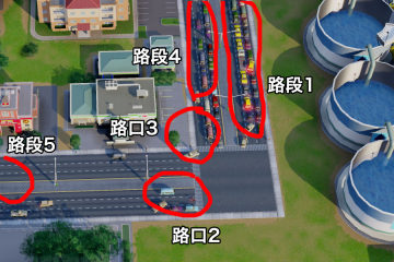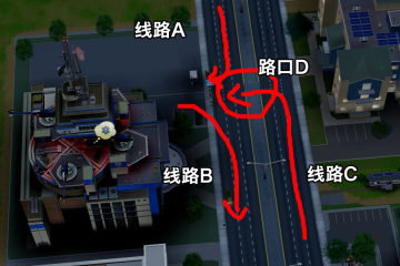 在建筑物中,有一些会额外产生属于自己的路口,如图中大道前的警察局,他在门前建了一个自己的小路口,因为有这个路口,从路线C巡逻回来的警车不需要从路线A回到警署。这种路口会对过往车辆产生很短暂的停顿时间,距离路口越近越能表现出来。虽然如此,但这类建筑物有个优势,就是不受道路行驶方向的限制(具体参看道路流向)。当然,也可以通过这个路口到达对面顺车道进行行驶,这里在图里就不画了。当然这个路口只给与该建筑物有关的车辆可用,如中学、小学的路口都只能校车通行。
