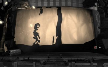 继续跟着父亲走,发现他去了电影院,可惜道路破裂的,这里需要先按一下灯开关,然后随着DIDI照射的影子前进,中间注意下断裂部分,要跳,来到影院牌子后面撞碎所有的支撑架子就能让DIDI也顺便过来了。
