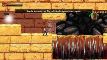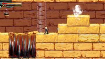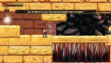 之后会遇到长坑,这些你直接跳是跳不过去的,这时用枪射击上方的靶心,攻击一次靶心后退一次,一直打到底,路就会自动铺上