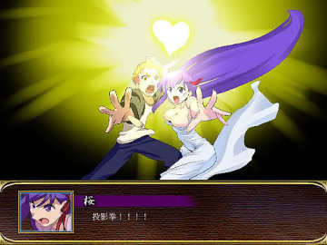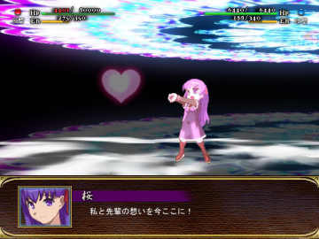 历尽艰难终于打倒了间桐脏砚和Assassin,现在要做的就是尽快救出樱。黑樱的HP有80000,在12000以下时发生剧情,这时要用士狼上去进行3次爱的告白,这段时间我方其他人员可以先回回SP和EN,告白完之后又发生剧情,BOSS“此世全部之恶”出现,虽然有100000HP可是还是弱的不行,以我方目前的实力一回合就能搞定。“此世全部之恶”被打倒后凭着小强精神又顽强的爬了起来,此时士狼和樱使出了失传的奥义LOVE&LOVE 投影拳终于彻底粉碎了BOSS。(最后一定要准备回复药……)