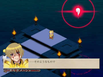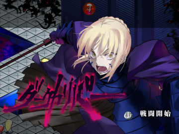 和女主角线一样,此话的出战人员和上战相同,这次已是第3次和依莉雅、B叔战了,B叔这次有100000HP,尽量集中我方主力一口气解决他,拖时间对我们不利,虽然B叔的十二试练看起来很厉害,不过用强力技能配合アタッカ和热血或魂打起来还是很轻松的,打完B叔后同样可以先回回SP和EN,之后把依莉雅打倒,剧情过后金闪闪出现,只用了一招EA就把所有人都打趴下了,之后过关(用SABER往前冲把……注意一下B叔和双女仆的高闪就行……)