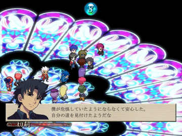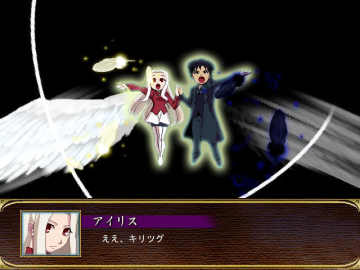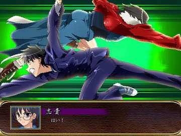 男主角这边是志贵和七夜的对决,七夜的回避率很高,由于志贵没有必中,所以要带一个有感应精神的人出来,否则要给七夜最后一击只能靠S/L了,打倒七夜后志贵本想问出樱被他们关在哪了,没想到七夜突然偷袭他,这时五月出来替志贵挡下了致命一击,之后志贵愤怒的把七夜击倒(可使用魔眼的合体技进行打击……也算过关的)