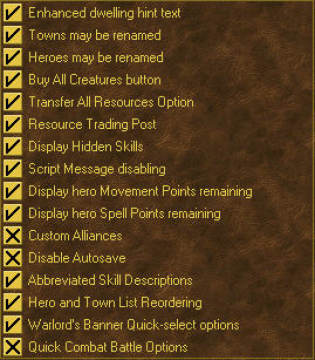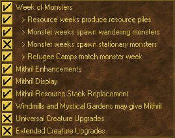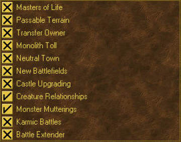 | A 选择怪物之周的允许类型。怪物之周的特产怪物能力会大大加强。资源之周会使相应的矿产量加倍,并且也会在地图上随机产生资源堆,游荡怪物和站立怪物两项不能同时选择。开启了这个功能之后,瘟疫之月将不会出现,每周的特产遵循以下循环:随机生物之周,随机资源之周,幸存玩家的生物之周。其中在玩家的生物之周,会挑选一种玩家部队的生物。右键点击沙漏图标可以查看本周特产类型。 B 选择此项将可以使用秘银,秘银也是WoG中的特色,最好选上; C 地图界面右键点击王国一览图标可以显示秘银数量; D 某些资源堆会重置为秘银; F 如果城镇中的升级兵种建筑已经建造了的话,那么所有该等级的生物可以在此城镇升级,比如地下城建造了高级蝎狮巢,则英雄在该地下城也可以把骑兵升级为冠军骑士; G 此项使得一些原本没有升级形态的生物可以升级,一些已经升级了的生物也可以再升级成新的生物。一般情况下必须访问高山堡垒(Hill Fort)才可以升级,但如果同时选择了F项则不必了,比如僧侣可以在建造了高级五级兵营的任意类型的城镇升级为战争狂热者。具体升级表见相关页面。 | |