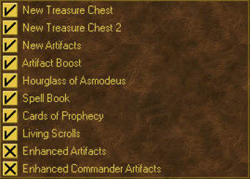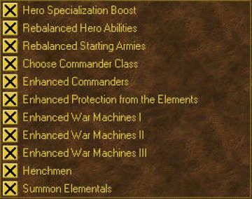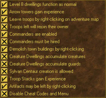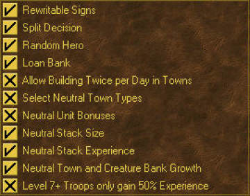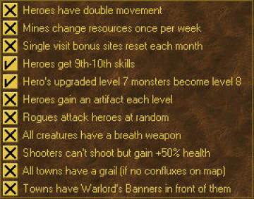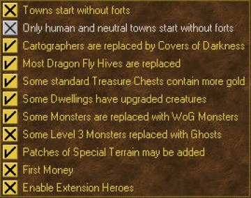 ![]() | A 游戏开始时没有城墙 B 只有玩家开始时没有城墙 C 绘图师重置为暗黑天幕 D 大多数龙蝇宝屋被重置 E 一些箱子有更多的钱 F 一些野兵招募地招募升级的生物 G 一些野兵重置为WoG新生物 H 一些三级兵重置为鬼魂 I 加入特殊地形 J 初始给予金钱与资源 K 允许特别英雄 |