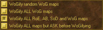 | 这里选择被WoG化的地图的种类。一般选C,则所有的地图,包括埃拉西亚的光复、末日之刃、死亡阴影和WOG地图都将被WoG化,并且WoG化前不询问。 | |