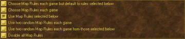 | A 每次开始游戏时选择地图规则,默认为上一次的 B 每次开始游戏时选择地图规则,默认为初始的 C 使用以下选中的规则 D 选用两套随机地图规则 E 使用以下选中的两套随机地图规则 F 不使用地图规则 设定好自己常用的规则后选C就不必每个地图都要重新设定了。 | |