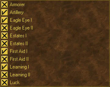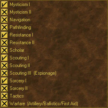 ![]() ![]() | A 防御术 B 炮术 C 鹰眼术 I D 鹰眼术 II E 理财术 I F 理财术 II G 急救术 I H 急救术 II I 学习术 I J 学习术 II K 幸运术 L 神秘术 I M 神秘术 II N 航海术 O 寻路术 P 抵抗术 I Q 抵抗术 II R 学术 S 侦察术 I T 侦察术 II U 侦察术 III V 魔力 I W 魔力 II X 战术 Y 作战术(炮术/攻城术/急救术) |
