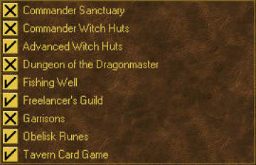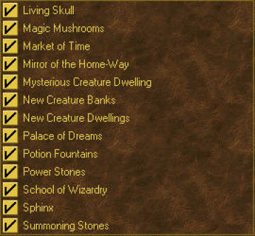 | A 避难所中可以复活指挥官; B 女巫小屋可以教指挥官技能或特技,每种英雄特技都对应了固定的指挥官技能或特技,具体见相关页面; C 女巫小屋可以加强英雄的初级技能为高级(需要2000金),也可以忘掉英雄的高级或专家级技能; D 龙堡的守卫全部变为暗黑龙,数量依有没有选定“英雄所带高级7级兵第二天升为8级”而不同,并且奖励也有改变; E 魔井可以钓鱼; F 自由者协会可以雇佣生物; G 随机在地图上设置关卡,这些关卡很特殊; H 每个方尖塔上都有随机的冒险魔法,英雄访问时可以不费魔法值使用,施法等级和英雄的元素技能等级相合; I 酒馆中可以赌博,稳赚不赔的建筑。 | |