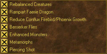 | A 改变了部分生物的能力,一定程度上使得各种族兵力趋于平衡,如果同时选择了E项,则很多改变失效; B 壁垒城(即金龙城)七级兵巢穴可招募的兵种变为了仙女龙和钻石龙,周产量减少; C 建造了城堡(Castle)与凤凰巢的元素城堡的火鸟/凤凰的周产量减为3,如果同时选择了E项,则减为2,即基本周产量减为1(与其它族七级兵产量相同); D 龙蝇更名为疯狂龙蝇,疯狂龙蝇比龙蝇增加了不反击、攻击后返回、疯狂目标三种特技,相当疯狂的兵种; E 加强了大部分生物的能力,相关页面介绍; F 土元素使者更名为变形元素,变形元素战前随机变形成其它生物,完全消灭敌人一支部队后再变形成该兵种,变形过程中总生命值不变,如果开通了生物经验系统,则以0级时的生命值为准,变形过程中生物经验值不变。很有趣的一个设定,初始变为农民还是变为神圣天使就得看运气了; G 神射手(Marksman)特技由攻击两次变为了穿刺射击(Piercing Shot)与降低防御,可以同时伤害到目标身后的敌人,弓箭手(Archer)更名为弩手(Crossbowman),拥有降低防御特技,这两种生物指数也有所改变。 | |