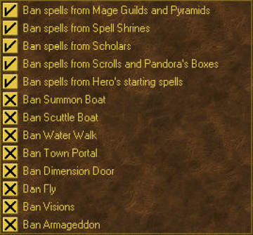 ![]() | A 不会在魔法塔和金字塔中出现 B 不会在魔法殿中出现 C 不会在学者中出现 D 不会在卷轴和潘多拉盒子中出现 E 不会在英雄的初始魔法中出现 F 禁止招船术 G 禁止毁船术 H 禁止凌波微步 I 禁止时空门 J 禁止异次元之门 K 禁止飞行术 L 禁止透视大法 M 禁止末日审判 |