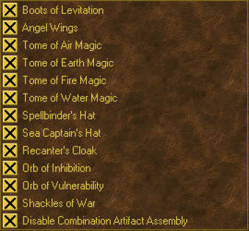 | 这里选择禁止的WoG3.58版出现的新宝物。 A 如果同时选择了“所有的城堡前都有一支战神旗帜”,则城堡前的战神旗帜仍然会出现,但除此之外再也不会出现了。 | |