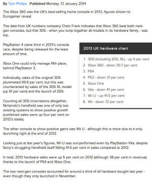 根据外媒游戏杂志eurogamer的报道,2013年度英国游戏主机销量排行中,任天堂3DS掌机占据首位,而微软的XBOX360是英国市场最畅销的家用机,尽管发售时间最短,索尼PS4成为了2013年游戏机销量的第三名,XBOX ONE只获得了第五名,排在在PS3之后。