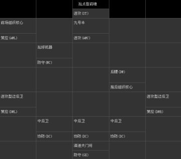 攻击线中三个位置分别是AML(前场组织核心),AMC(9号半),ST(抢点)。其中AMC和ST只在前场逼抢,AML会防守至自己半场。