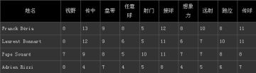 进攻呢?首先看传球次数/90分钟,Pape Souaré(41.25)、Laurent Bonnart(38.44)、Franck Béria(35.95)分别是全队前三名。说明边后卫在比赛中获得大量的传球机会,所以对于能影响高质量直传球的属性,都应该综合考虑,例如传球/想象力/视野。由于进攻的数值很低,可以看出关键传球很差,就算最好表现的Franck Béria,也只有25个,场均0.69个,也就是35.95次传球中,只有0.69个创造出机会,可怜的2%。最后是传中,从成功率来看,传中数值是13的Franck Béria的17%的成功率,全队第二。影响成功率的还有抢点的人数,对于单前锋来,我认为一个稳定的顶级传中成功率应该30%,每三个传中就造成一个抢点。但是必须看到,4个边后最高的场均传中次数很低,最高的Adrien Rizzi也只有1.39次,也就是说边后卫传中造成的威胁非常非常少,差点可以忽略不记了。
