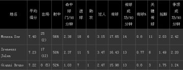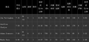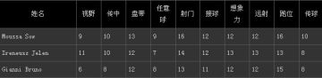 前锋的数据还是比较靠谱,其中有项数据需要留意,盘带分别是13和12的Sow/Jelen,场均过人分别有3.15和3.47,对比盘带18的Eden Hazard的数据也不会差多少,这样如果将数值绝对化,那么意思就是ST这个位置上有大量的过人机会,才能使数值差的一方在场均值上追上数值高的一方。另外这个位置上三名前锋的场均成功抢断是接近2,这也是队员更多的逼抢战术指导下的结果。