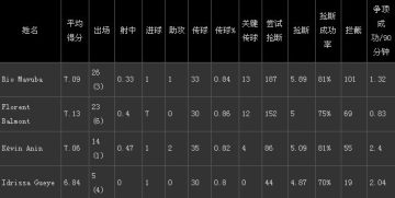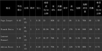 先看防守,场均抢断最好表现的Adrien Rizz和Franck Béria分别处在全队抢断排名的第二和第三,而场均拦截分别是4.28和5.17,是队内第二和第一。值得一提的是Adrien Rizz的数据相当出彩。而Laurent Bonnart和Pape Souaré是DML,数据上体现不如DMR,但是要留意到,DML前面有个AML也是会帮助阵地防守的,所以数据上比不上DMR的位置。边卫在防守的表现和整个中后场的表现是匹配的。