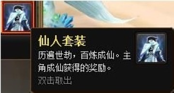 历遍世劫,百炼成仙,主角成仙即可获得奖励仙人套装,玩家们双击套装既可以取出。类似时装,但是是永久没有时限的,不影响自己本身的衣服装备佩戴。