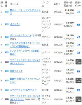 《星之卡比 三重豪华》获得日本游戏销量排行榜冠军 来源: 飞翔小编feichenpan 2014/1/16 10:34:51 浏览量:481 根据上周日本游戏销量排行榜的名次,前五名分别被任天堂3DS掌机游戏占据,足见在日本市场3DS的绝对占有率,获得首位的是3DS新作《星之卡比 三重豪华》,其首周销量为21.4万,紧随其后的是《智龙迷城Z》,这周销量为5.2万,累积销量突破121万,获得第三名的是《口袋妖怪XY》,这周销量3.4万,累积销量387万。最新一期日本游戏销量排行榜前十(2014年1月6日-1月12日)