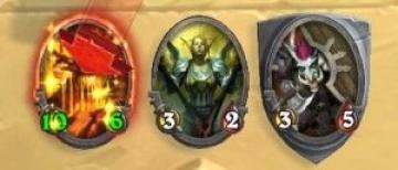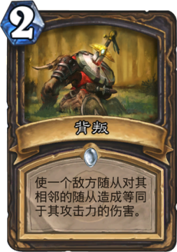 或许最令人难受的三张牌都是盗贼的,背叛是其中最烦人的一个,它的效果是让一个随从对自己的同伴造成伤害。如果你有一个8/8的随从或者大个子嘲讽随从,那么你可能就要吃背叛的苦头了。如果在回合结束后你的一个随从可以造成足够的伤害,那么盗贼不对熔岩巨兽使用背叛的话就是个傻子。对抗盗贼经常失误的地方就是信心慢慢的以为自己赢定了,然后被一个背叛杀掉两个随从。在对抗盗贼的时候你几乎要时时刻刻考虑背叛的存在,因为它的费用很低 - 它可以在游戏的任何时期出现。下图就是一个背叛的例子,这样摆放随从的话,盗贼通过背叛就无法造成最大效果了。