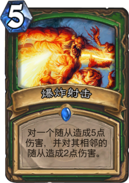 这张牌属于控场型AOE技能,如果你的场上放满了随从(7个),这张牌可以最多杀掉3个随从。在你扩大自己随从数量的时候,那么接下来的情况会更加复杂。你无法预知它会对你造成怎样的伤害,你只能最大程度的降低它的破坏力。猎人也有一个完全随机的致命射击,这张牌无法选定目标,但是只需要3费即可使用,可以在前期移除威胁很大的随从。尤其是德鲁伊这样与其它职业相比更早放出强力随从的职业。爆炸射击理论上可以比致命射击造成更大的破坏,问题的关键是一个有威胁的随从周围是什么(比如周围的随从生命值大于3),那么你只能浪费一部分伤害才能避开2点伤害杀不死人的结果。