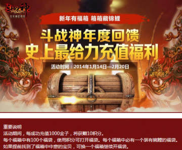 1、2014年1月14日10:00~2月20日24:00,在斗战神内以任何形式充值金子,每成功充值100金子(可累加),可获得1点充值积分。