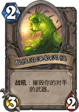 即使没有特效,2费3/2也是很不错的属性。而且,沼泽酸性软泥怪很可能在打出的同时就干掉对手的一张牌。虽然对于某些英雄来说这就是一张白怪,但即便如此,它的价值依旧很高。当它发挥特效的时候,立刻移除对手的武器是很多对手的噩梦。摧毁武器比摧毁随从更给力,毕竟2/3的武器能造成的伤害比2/3的随从更多。
