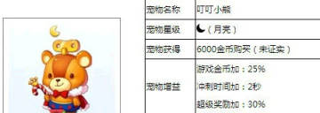 天天酷跑叮叮小熊有一件公主式的披风,头上竟然有一个发条,会不会是玩具熊呢。这个天天酷跑PVP新宠物可以加成游戏金币、冲刺时间和超级奖励。天天酷跑PVP新宠物叮叮小熊不仅可以每8小时产生800金币,更厉害的是在天天酷跑叮叮小熊在天天酷跑PVP模式中的得分加成4%,是不是爽翻天?