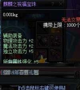 dnf麒麟之祝福宝珠怎么得 来源: 飞翔小编 2014/1/21 11:18:28 浏览量:1134 在《dnf地下城与勇士》中有很多道具等待着大家探索搜集,最近有不少玩家表示“麒麟之祝福宝珠”无法交易,获取方式有些复杂。下面给大家简单讲解dnf麒麟之祝福宝珠的获取方式,希望对大家有所帮助。dnf麒麟之祝福宝珠怎么得购买天马赐灵礼包和灵马祈福礼包可以获得。dnf麒麟之祝福宝珠属性:部位:辅助装备属性:所有属性强化 +5物理攻击 +2魔法攻击 +2独立攻击 +5