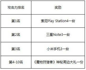卡牌手游《魔物狩猎者》将在2014年1月20日至1月26日期间举行“最强猎魔师野战卡组攻击力排行”活动,活动期间官方将会对玩家野战牌组编成的攻击力合计进行排名,大家有机会获得索尼PS4主机,三星Note3手机,小米3手机等游戏周边等实物大礼。
