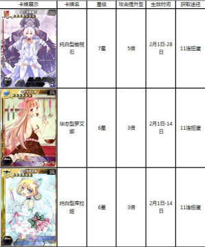 《百万亚瑟王》纯白和华恋型新卡的获得方法 来源: 飞翔小编 2014/2/3 20:36:42 浏览量:288 卡牌网游《百万亚瑟王》近日更新了大量纯白和华恋型新卡,这些卡在2014年2月1日至28日期间将有5至两倍的攻击特效,这里给大家分享下《百万亚瑟王》纯白和华恋型新卡的获得方法。纯白和华恋型新卡获得方法一览: