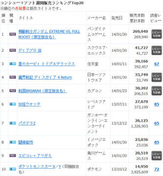 根据上周2014年1月27日至2月2日的日本游戏销量排行榜,PS3新作《机动战士高达 究极对决Full Boost》首周销量突破26.9万套,获得第一名实在是可喜可贺,看来高达之类的游戏还是受众广;紧随其后的是《暗黑破坏神3》的日版,首周销量4.1万,成绩尚可;获得第三名的是3DS掌机游戏《星之卡比 三重豪华》,上周销量3.9万套。