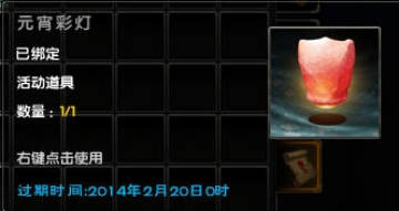 《九阴真经》在2014元宵节情人节期间将开展一系列活动,其中就有名为“元宵猜灯谜”的活动,在活动期间元宵彩灯使用后可选择元宵灯谜并放飞,同时任意玩家均有可能收到其他玩家放飞的元宵彩灯,放飞元宵彩灯以及回答元宵彩灯内的灯谜均可获得奖励。