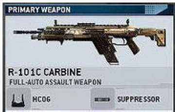 R-101C卡宾枪,全自动突击步枪,可装配机瞄、红点、2.4倍光学瞄具、不知名圆形瞄具、枪口抑制器,其他未知。