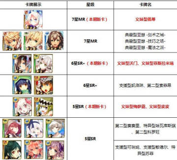 本期扭蛋机中新增7星MR义妹型佩蒂、6星SR+义妹型沃门、6星SR+义妹型菲斯拉米瑞、5星SR义妹型梅萨露、5星SR义妹型皮皮,2月28日后将从扭蛋机中移除,各位亚瑟们要抓住机会哦~