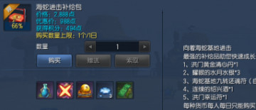商城多了一个每日礼包“海蛇进击补给包”,售价998点卷。里面有一些副本救急道具以及装备强化道具,其中有耀眼的水月水银3个,用于进化突破装备,不会失败。