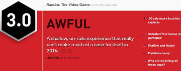 史泰龙经典电影改编的游戏《第一滴血》现已登陆PC和主机平台,国外著名游戏评测媒体IGN也对该作进行了一番详细评测,最后只给予其3.0分的差评,认为这一部肤浅的按照既定路线的射击游戏,在如今的2014年已经无法再称得上有什么创意。