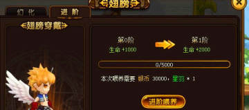 上面我们提到了翅膀进阶,你一定已经想知道这是个神马东东了。在幻化界面的右边,便是进阶界面。在这里,我们可以看到进阶的详细说明。在《冒险契约》中,翅膀分为十二阶,每一阶增加一定的生命值,阶数越高加成越多,据说在到达十二阶时,加成可以达到六位数!当你拥有并装备进阶。翅膀后,即可开始给翅膀进阶需要给翅膀喂养银币和星羽,每次喂养增加一定经验值,经验值满时进阶。星羽在翅膀副本里可以产出,找皓月城里的“连斩大师”即可进入翅膀副本,每天可以刷3次,大家一定不要忘记哦!