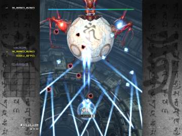 然后换黑属性用同样的方法攻击大型白机。随后出现的两个大型机也可以这样打,如果大家想要多贪分也可以算准连锁攻击中间的两列敌机。。(----增援:最多会出现6排3×3黑白相间的敌机,大家一定不要乱打,继续连锁吧。)