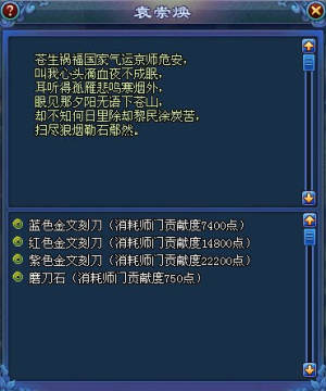 四大师门掌门处增加物品兑换,使用少量师门贡献度可兑换磨刀石;