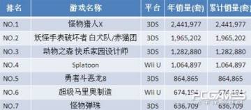 而从软件市场来说,畅销榜TOP10的产品全部出现在任系平台(并且绝大多数都是3DS),前4位的产品年内销量均突破百万套。另外《妖怪手表》系列在TOP10中占有2席也着实让人感叹这一系列在日本的超高人气。排名年度销量榜首位的是CAPCOM旗下的《怪物猎人X》,超过了去年由《MH4G》创造的238.1万的记录。